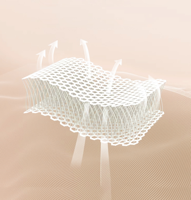 由“X-90°”結(jié)構(gòu)組成,雙面網(wǎng)孔,六面透氣,內(nèi)部空氣容量可達(dá)90%以上,水汽自由循環(huán)穿梭